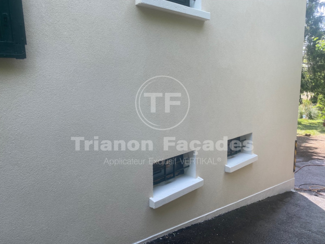 Après avoir nettoyé les façades à l’aide d’un produit anticryptogamique, nous avons pioché les parties le nécessitant avant de réparer au mortier compatible avec le support. Les fissures du pignon ont été traitées au VERTIKAL FISSURE F, et préconisation particulière, spécialement conçue pour résister au retour des fissures jusqu’à 2mm a été mise en œuvre : le VERTIKAL-FLEX. C’est un revêtement très riche en résine, imperméable et respirant, grâce à sa microporosité.