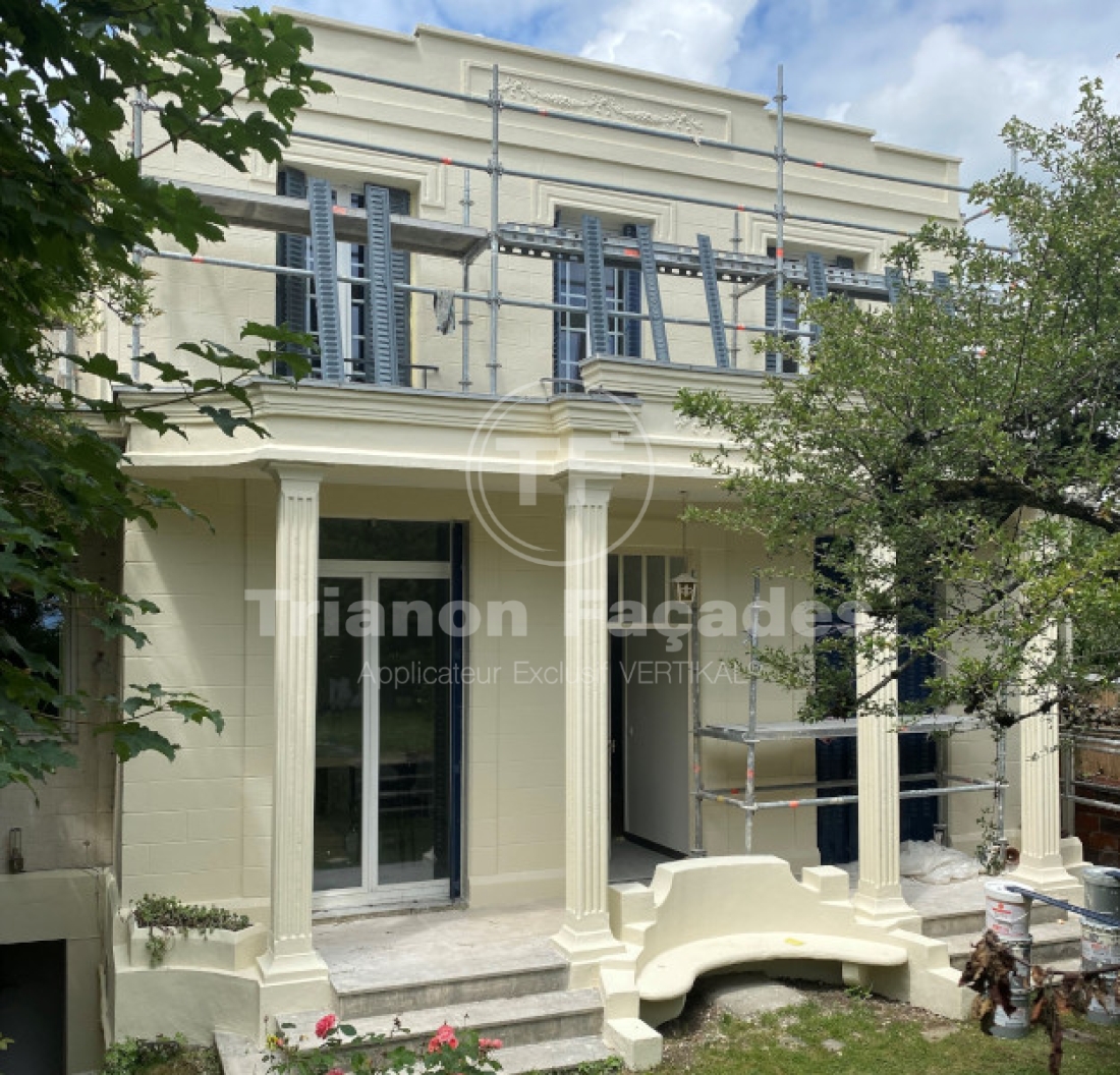 Après reconstitution des modénatures au mortier fibré, nous avons appliqué un primaire d’accrochage très garnissant avant d’y appliquer un revêtement semi épais riche en résine qui apporte une imperméabilité à la façade tout en la laissant respirer grâce à sa microporosité. Ce revêtement résiste au faïençage et aux microfissures ce qui était parfaitement adapté à la façade gauche particulièrement abimée.