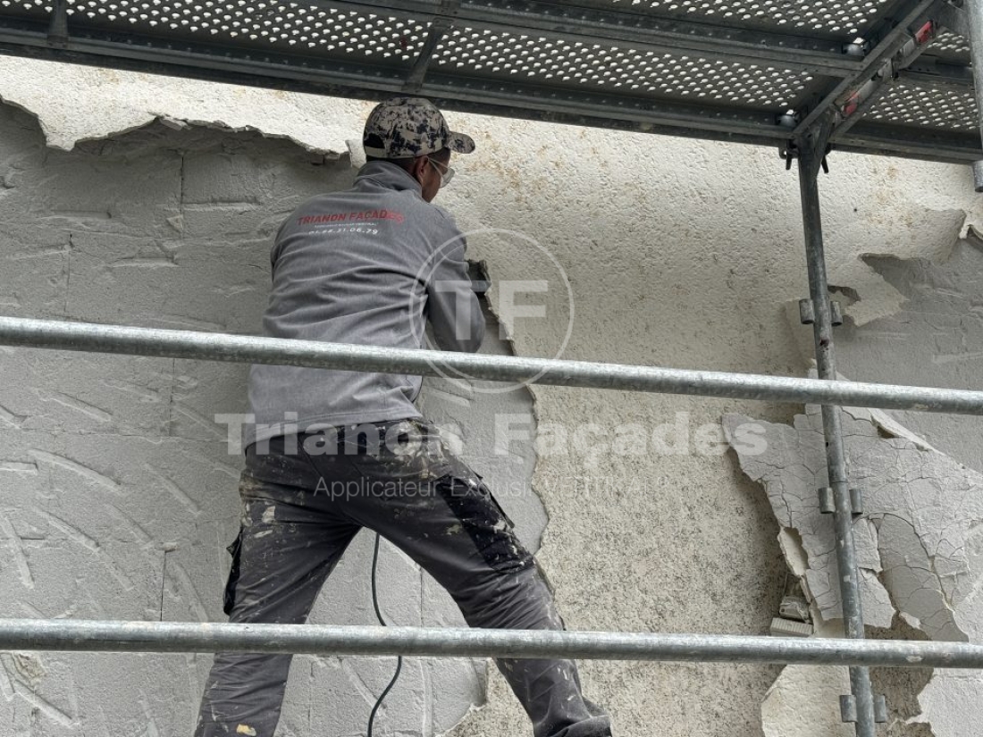 L’enduit qui recouvrait ce pavillon de Chavenay dans les Yvelines était recouvert d’un Revêtement Plastique Epais à bannir sur les façades car il n’est pas respirant. En effet les murs de façade ont besoin de laisser passer les vapeurs d’eau afin d’évacuer l’humidité qu’ils contiennent. L’humidité peut venir des remontées capillaires plus ou moins prononcées, mais aussi simplement la vie d’une maison: lorsqu’on prend une douche, qu’on fait la vaisselle, la cuisine, ou simplement lorsqu’on respire. Cette humidité a besoin d’être évacuée et c’est pour ça qu’on entend beaucoup parler de VMC ou Double flux qui compensent l’isolation importante de nos jours qui ont pour conséquence de diminuer l’évacuation de l’air humide.